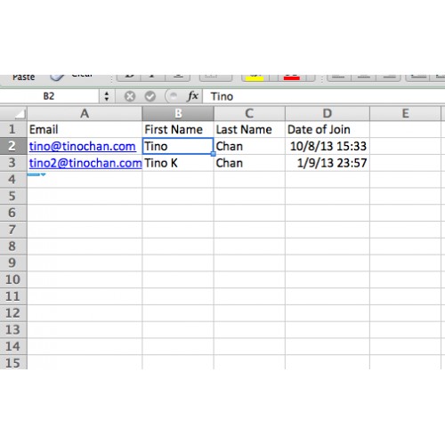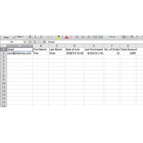 - CSV file contains Email, First Name, Last Name, Date of Join, Last Purchased Date, No. of Orders and Total Purchased Amount