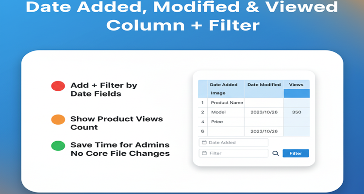 Enhance your OpenCart admin product list by adding Date Added, Date Modified, and Viewed columns along with filters. Quickly search and manage products by important dates without extra clicks