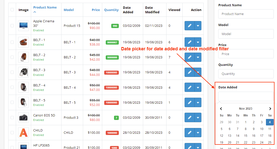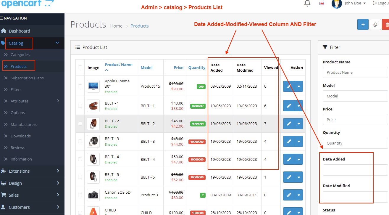 Date Added, Modified & Viewed Column + Filter – OpenCart Admin Product List Extension 2.x + 3.x + 4.x