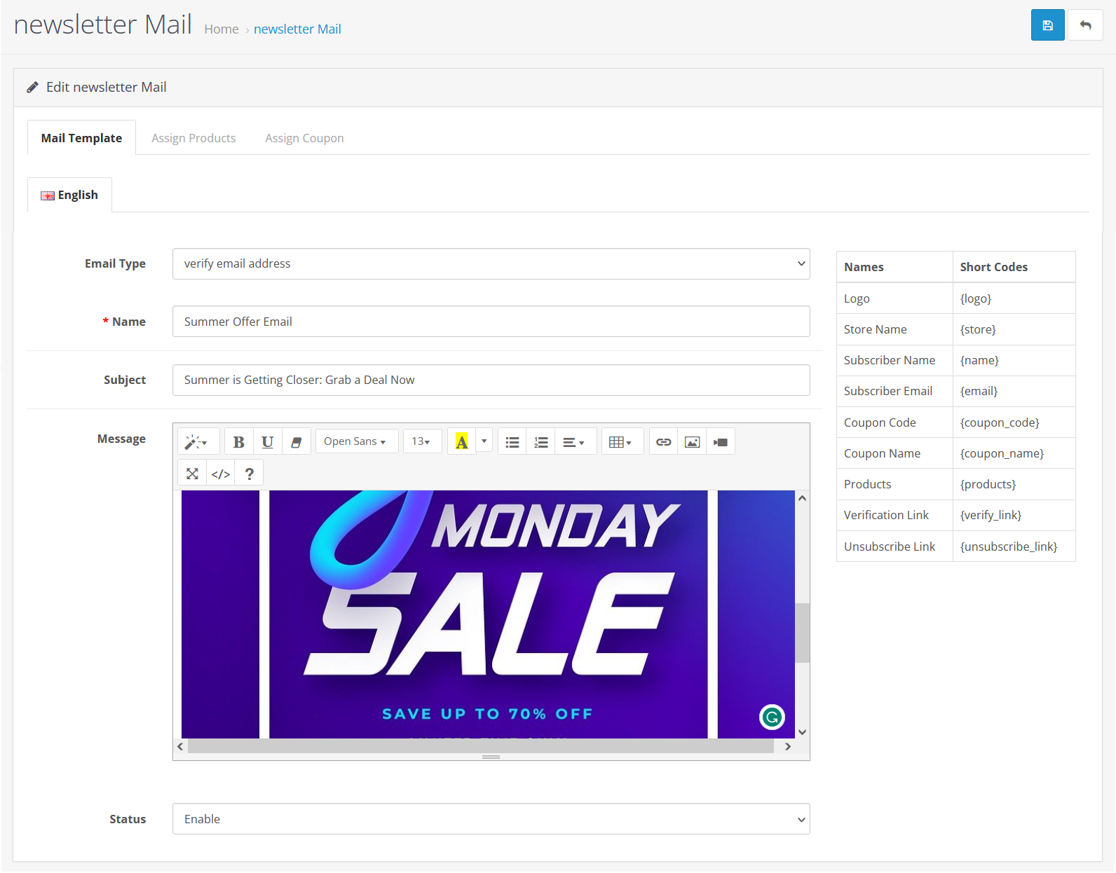 Unlimited Newsletter Templates: OpenCart newsletter extension lets you create visually appealing newsletter templates in HTML or plain text, designed to increase website traffic and engagement. Admin can add the products in the email template and select the coupon code to give the discount.
