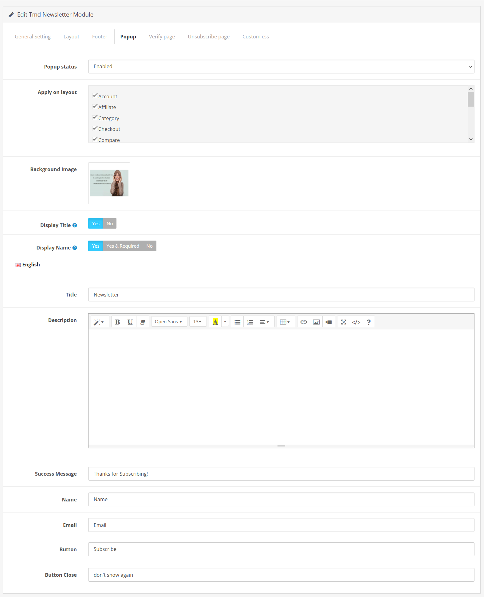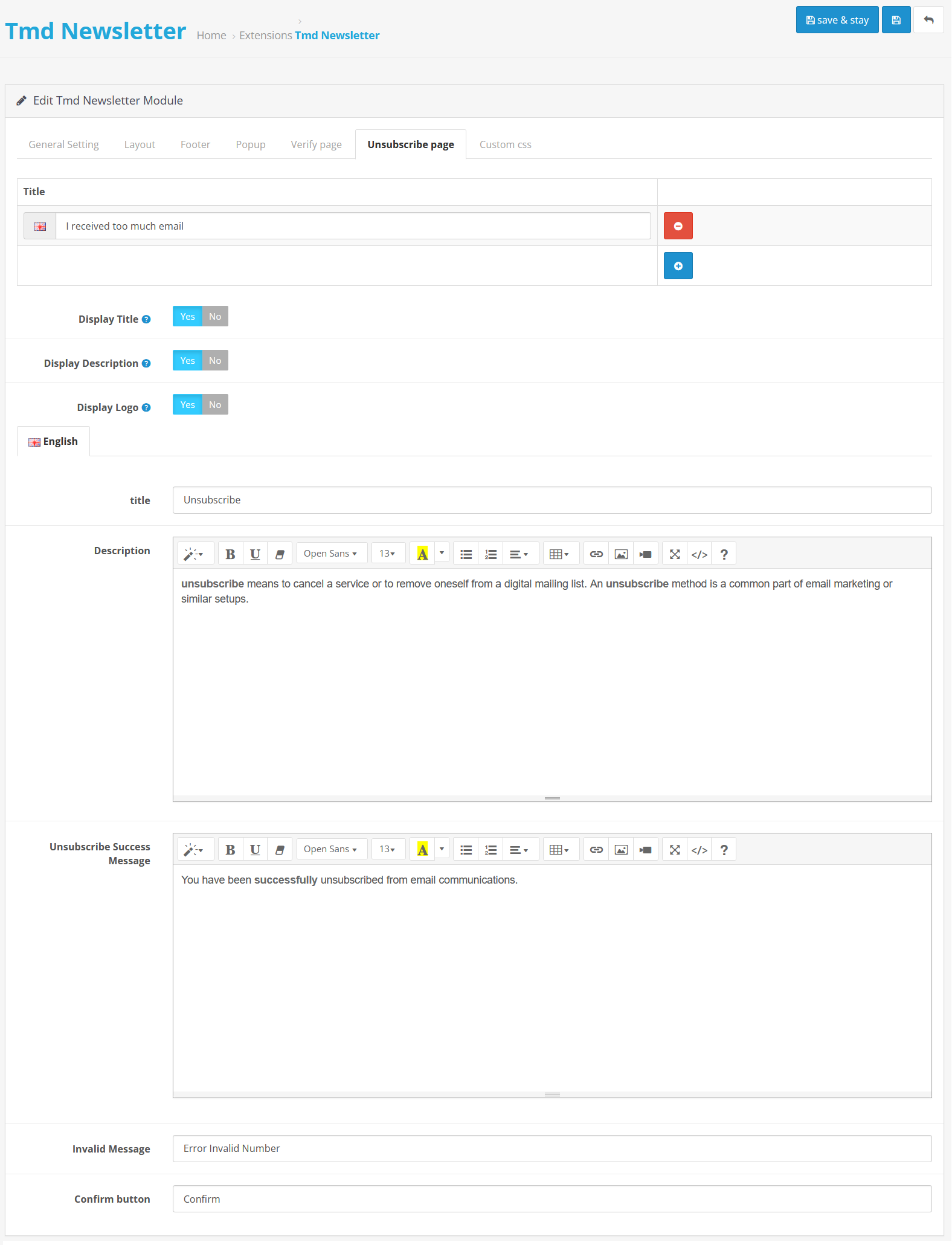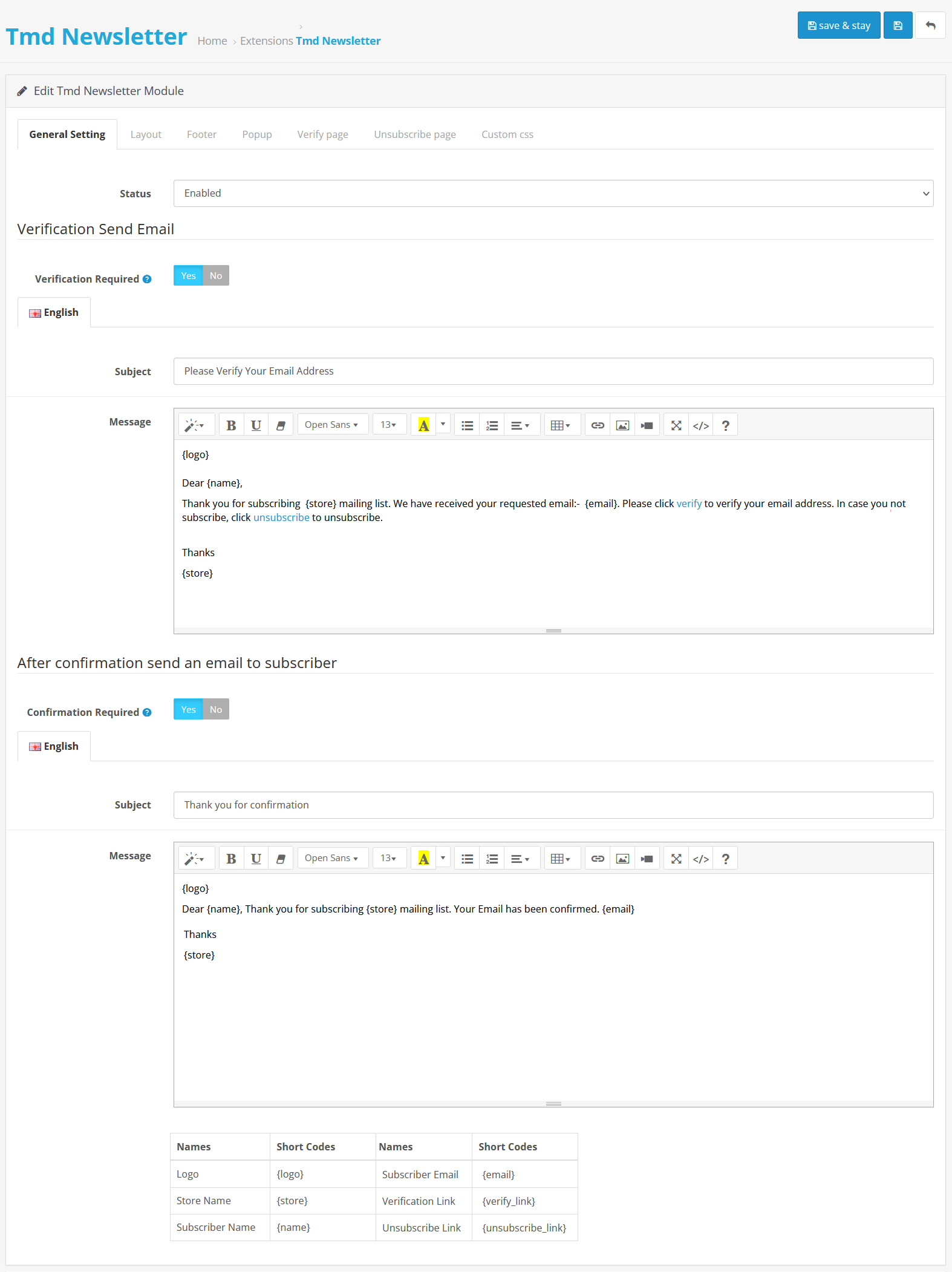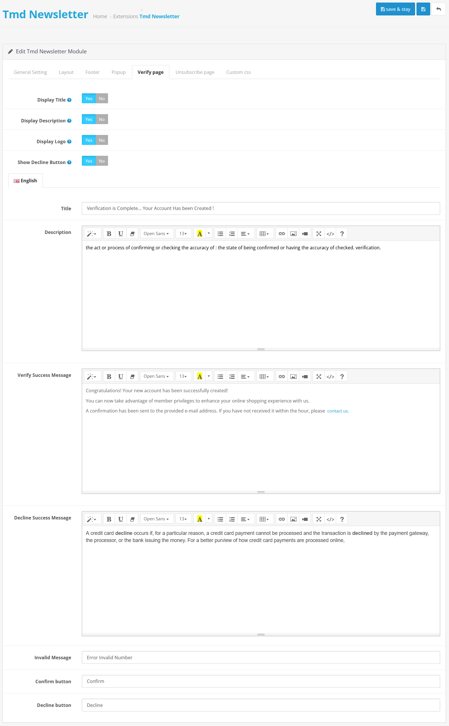 Verification Success Page: User can give their consent by hitting the email verify option in the OpenCart newsletter setting. This extension lets you customize the email verification page by writing the success and decline messages.