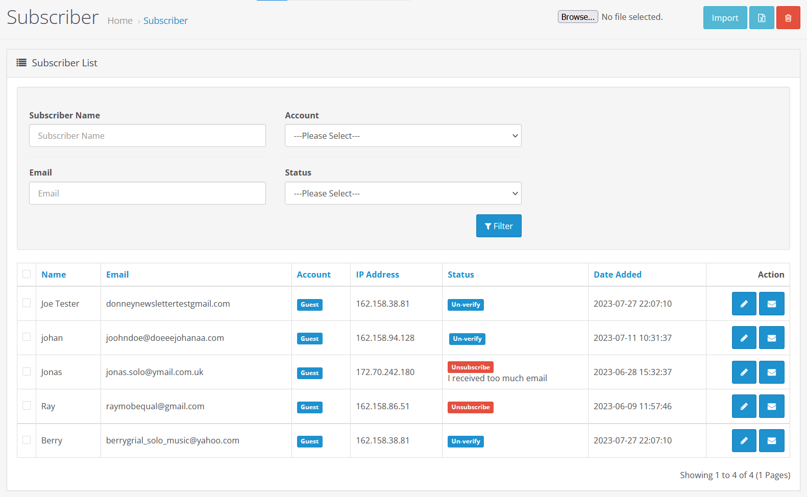Subscriber Management: There is a newsletter subscribers list present in a tabular with an email-sending option. The admin can add a new subscriber, update the subscriber's status or remove it from the list. Use the filter to get the required subscriber information.