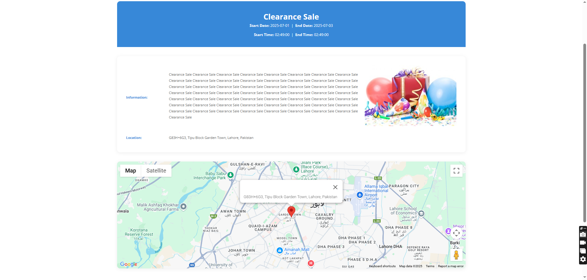 - Location (displayed on Google Maps using Google Maps API)