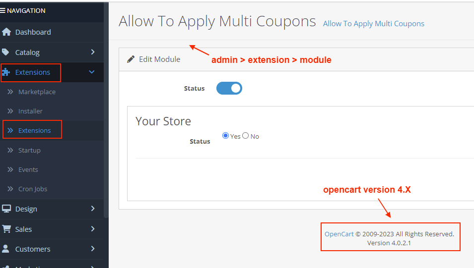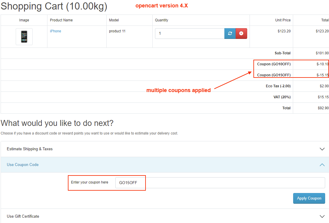 ✔ Default OpenCart allows only one coupon – this module removes that restriction