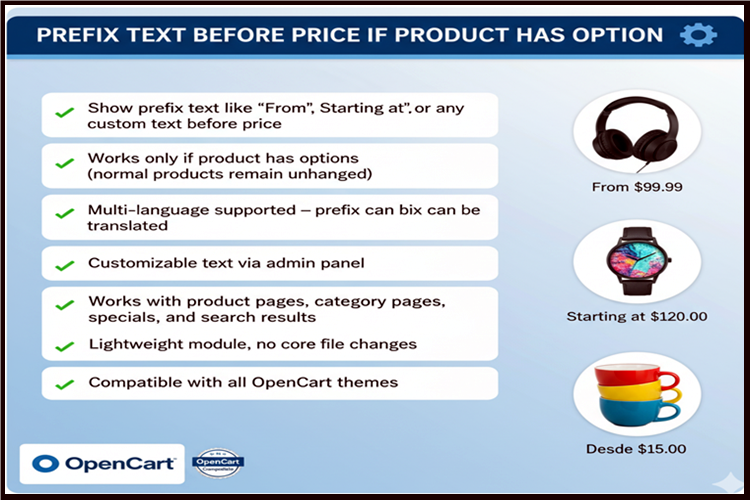 This module allows you to automatically display a prefix text before the product price whenever a product has options. Ideal for stores selling configurable products (like size, color, customizations) where option-based pricing may confuse customers.