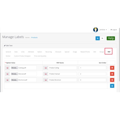 Admin can upload PDFs to products in two ways: either one by one (manual) or all products together in bulk using Excel. This makes it fast and simple for any store.
