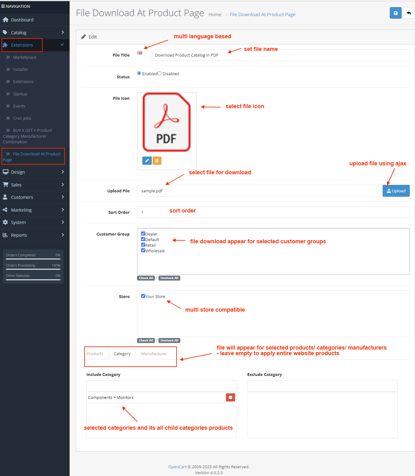✔ Unlimited File Uploads – Attach unlimited files to products, categories, or manufacturers.