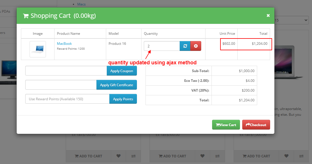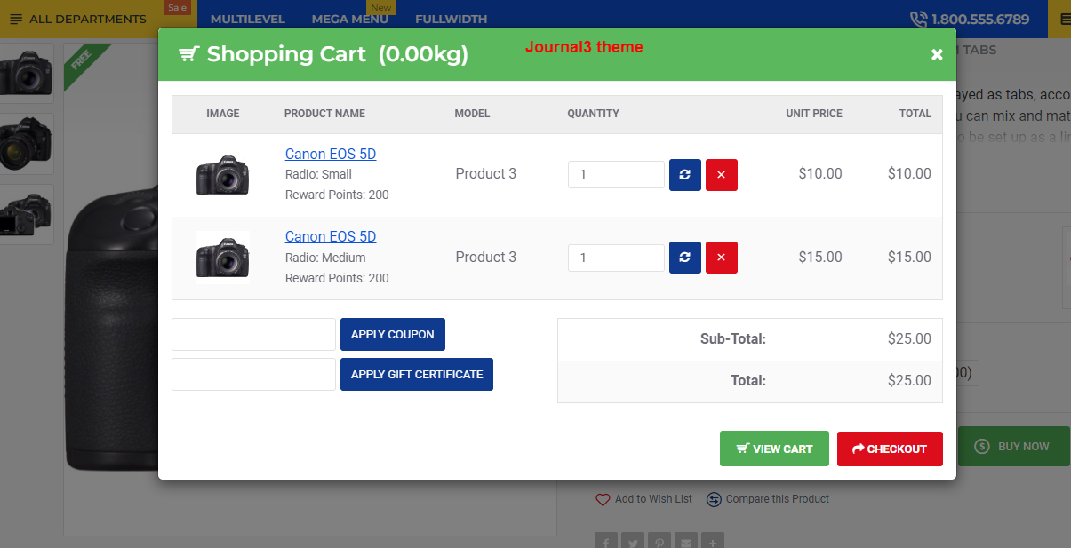 Show shopping cart in a popup when a product is added. Customers can update quantities, remove products, and apply coupons or rewards directly from the popup for a seamless shopping experience.