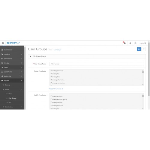 9.Now click on "System" then User Groups Tab, click on Select All link of Access Permission and Modify Permission and save it.