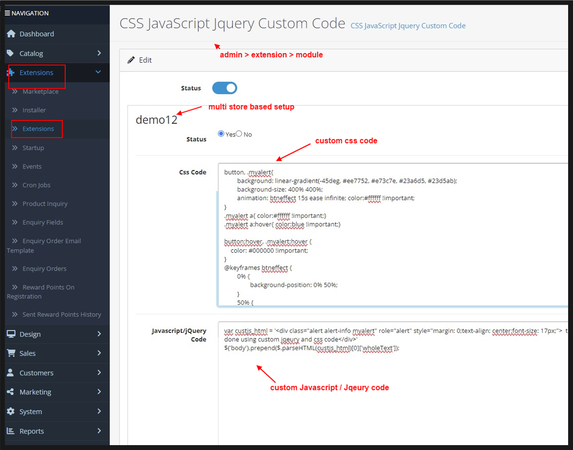 multi store based custom Css, javascript, jqeury code. with status enable / disable. helpful when each store wise tracking code, or custom css code