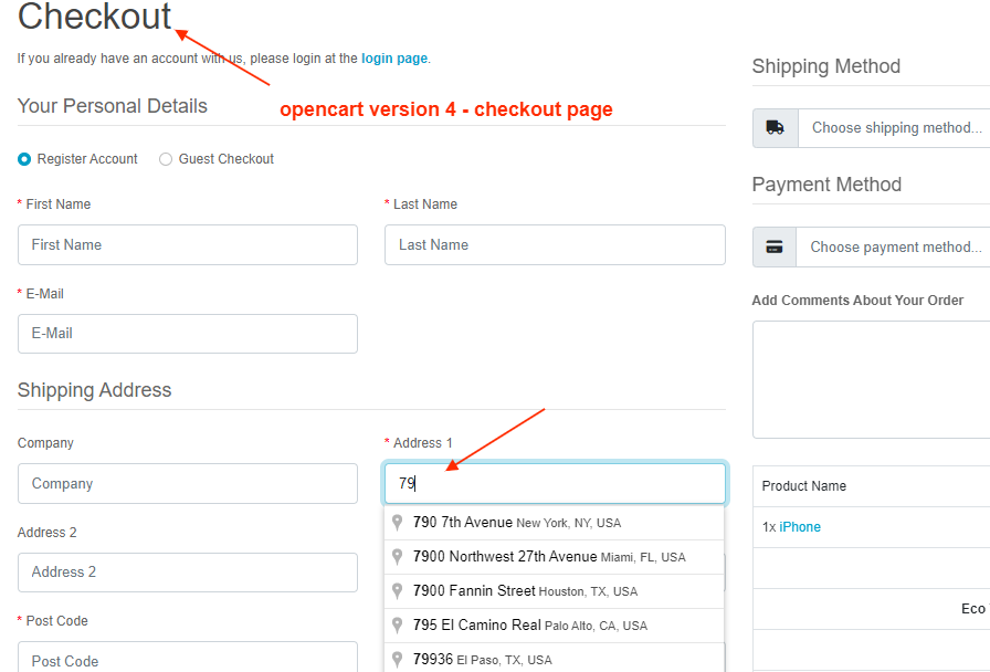 Checkout Page (Guest/Registered) – showing Google address autocomplete in action.