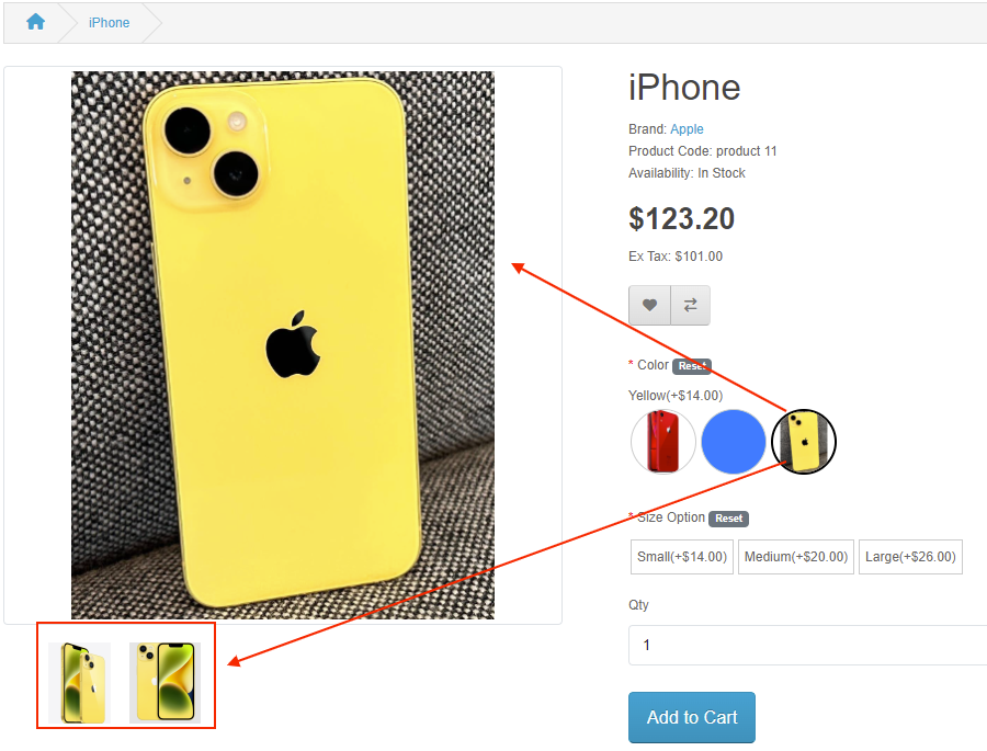 Show product options with color, color variations, and size box for your customers. Supports color codes, images, or pattern images for select, radio, and checkbox option types. Appears in product grid/list and product details pages.