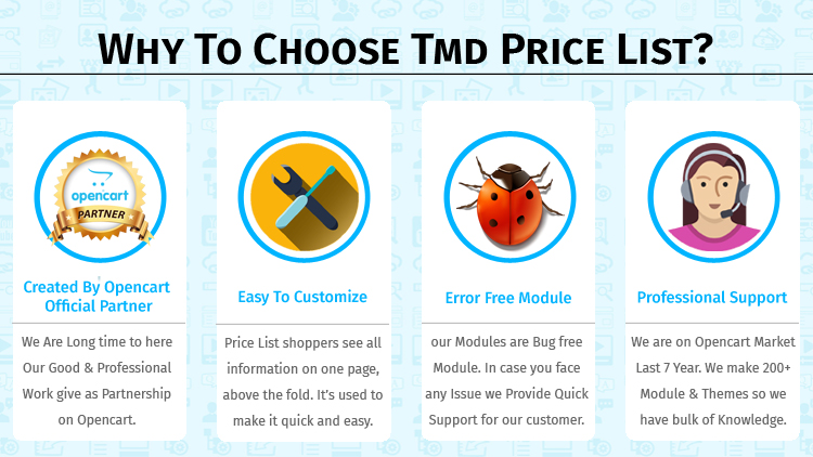TMD made this module to work on OpenCart versions 2.x and 3.x versions. A module can be easily installed via the upload module section in admin, on your website. Because this module uses OCMOD. Which does not overwrite core files. Opencart product price list extension also works with could online.