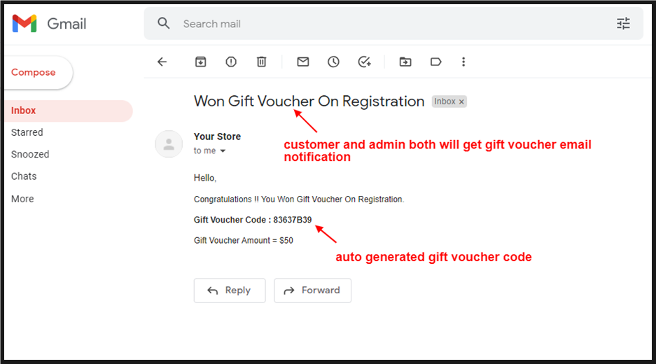 gift voucher code auto generated when new customer register. admin and customer both will get gift voucher email notification
