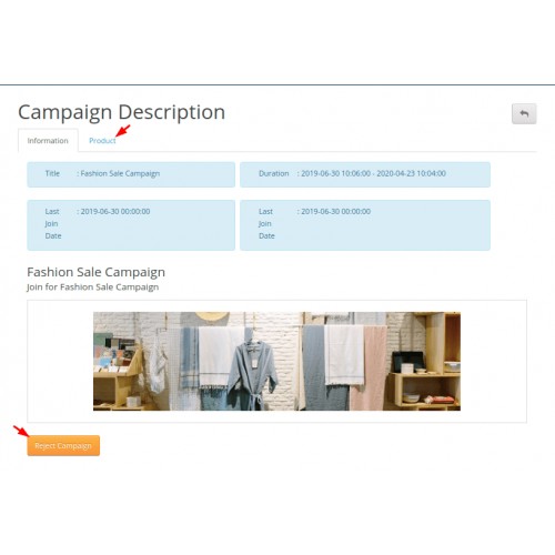After joining the campaign, the seller can also reject the campaign. The seller can add their products to the joined campaign from the product section.