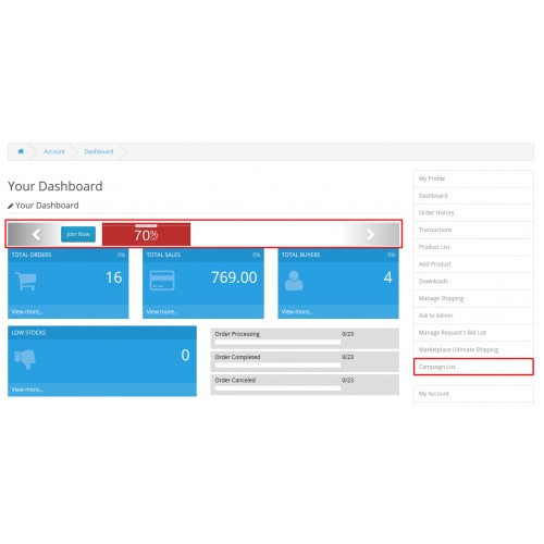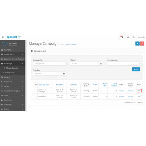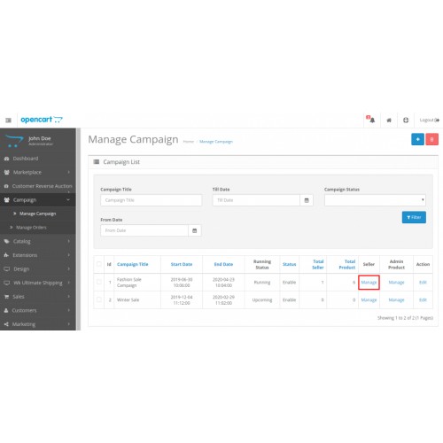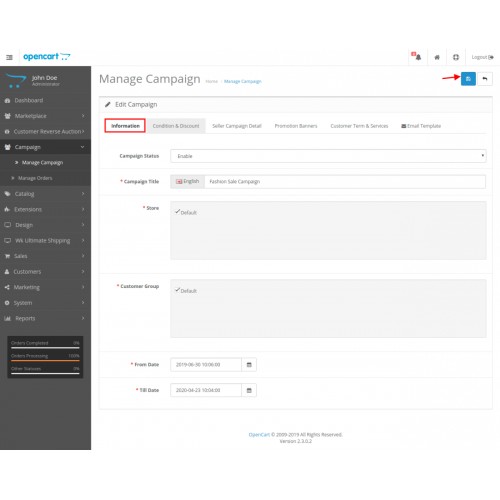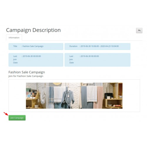 Opencart Marketplace Campaign- helps the admin and the sellers to increase the sale by running the marketing campaign. Using this extension, the admin can create the campaign and send the campaign joining request to their marketplace sellers.