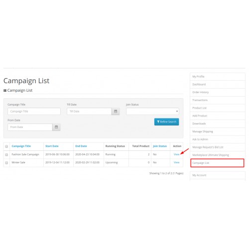 The seller can manage the Campaign List from the Marketplace seller dashboard as shown in the image below -