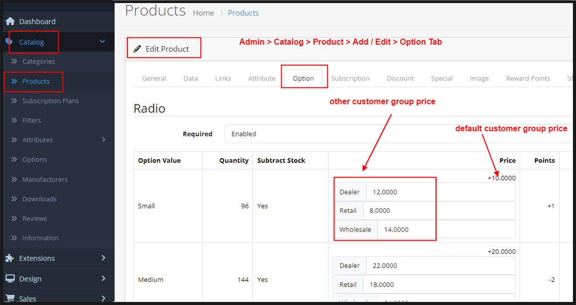• customer groups based product option price from admin > catalog > product > add / edit > option tab > price column