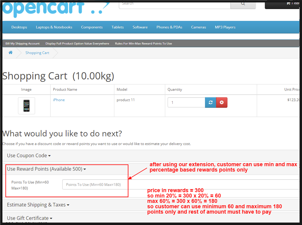 - default in opencart if customer has 500 points balance so he can use 200 points got iphone product as free of cost which is not good. So our extension help you to set min-max percentage limit of reward points usage, thus customer can use maximum points = 120 and rest of amount must have to pay even customer has 500 points balance