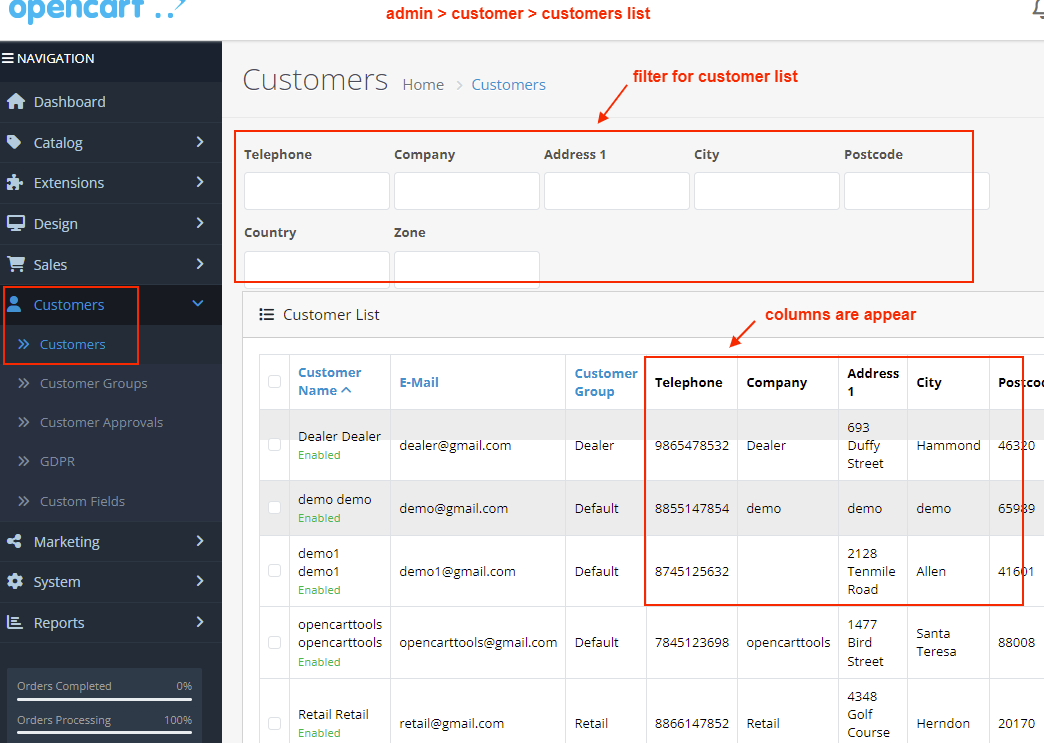Enhance the OpenCart admin customer list by displaying additional columns and filters. Easily view and manage customer details like telephone, address, company, custom fields, and more directly from the customer list page.