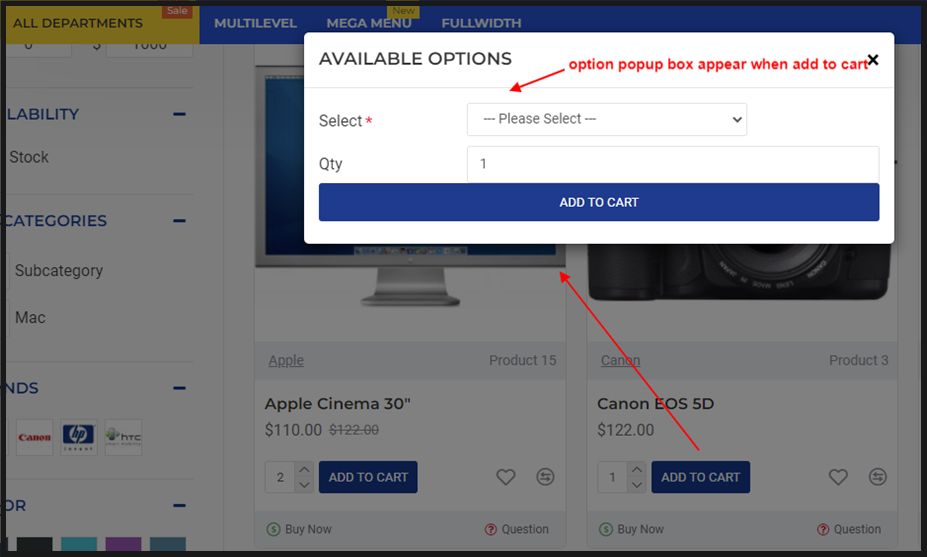 • Product option popup appear when clicking on add to cart button from product grid/list like home page, category, special, search, manufacturer products pages