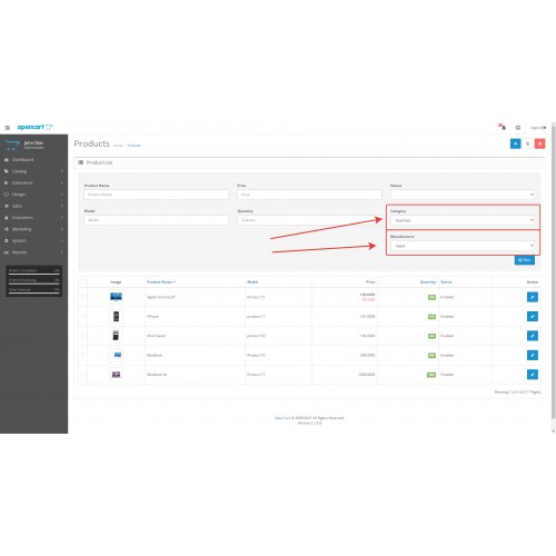 The module allows you to filter products by manufacturer and category in the admin area of OpenCart.