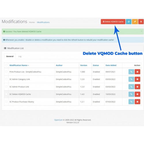- Just go to 'Extensions > Modifications', then you will see 'Delete VQMOD Cache' button as shown in the picture.
