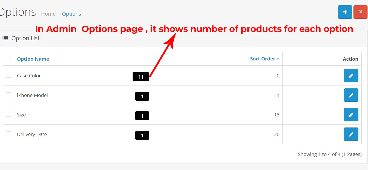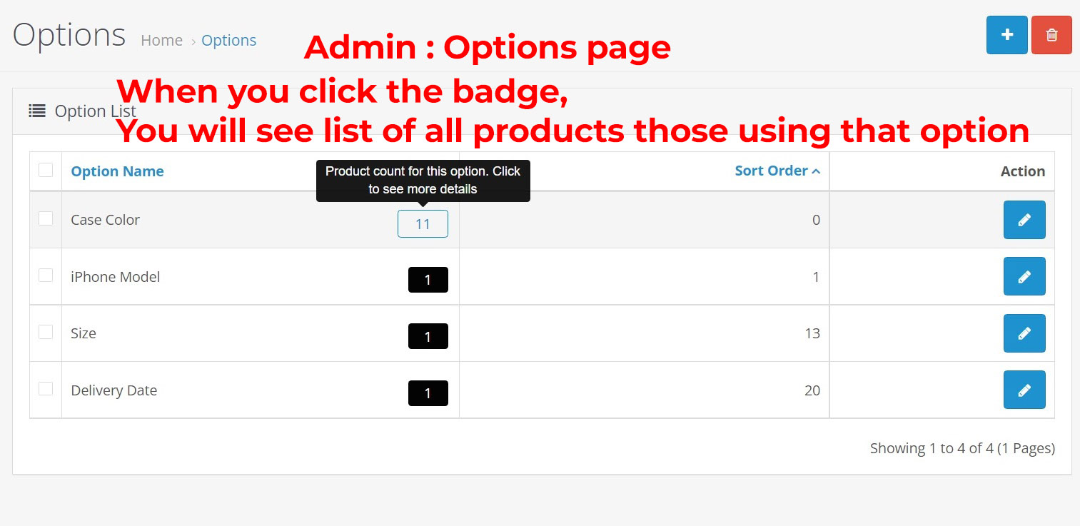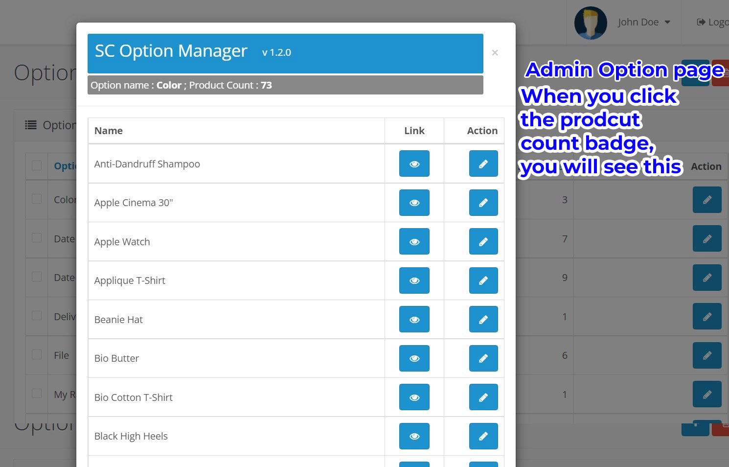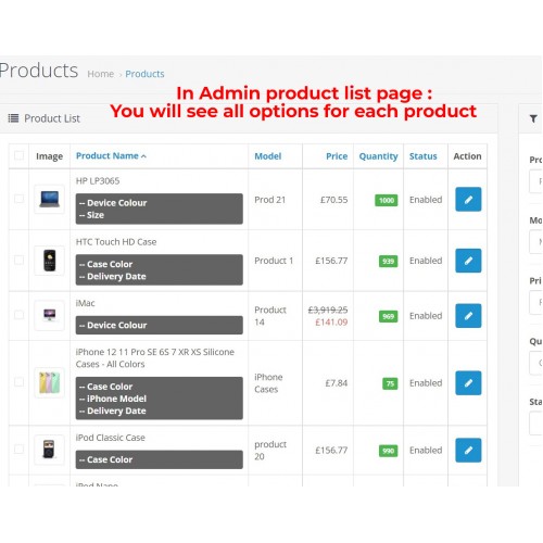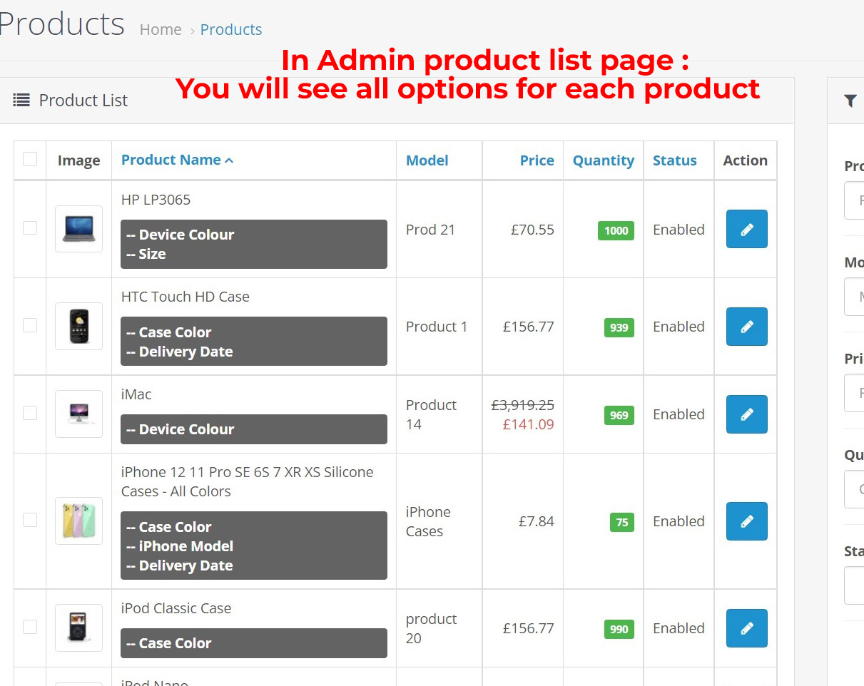 -- Each product has link to admin product edit page and website product view page. - In Product List Page :