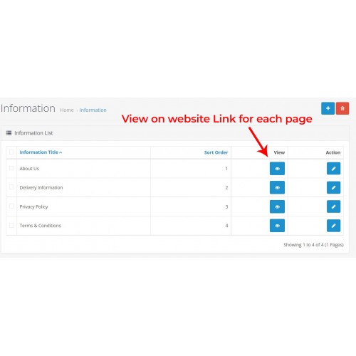 FEATURES - In Admin Information List Page : You will see 'view on' website link for each page. So you don't have find the link for the page. Just click the link and view on your website. - In Edit Information Page : 'View on' website link. So you can view the page on website as you save.