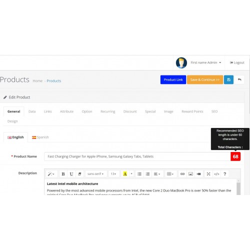 - Display number of characters in product title in product edit page.