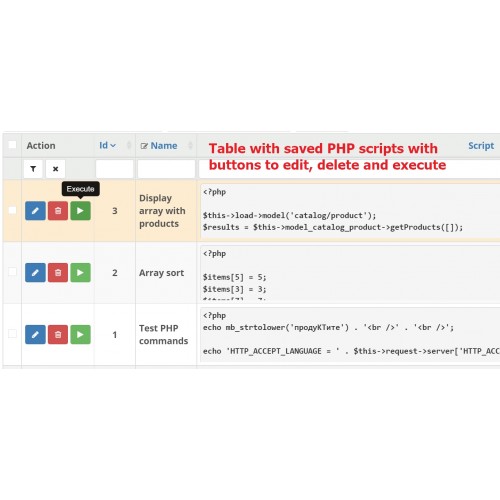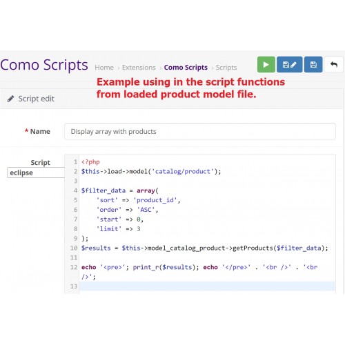 The code snippets we create run directly in the Opencart controller, so the entire environment and admin sessions are available for use and testing. You can load model files from the installation and call functions from the controllers on the administrative part of the site.