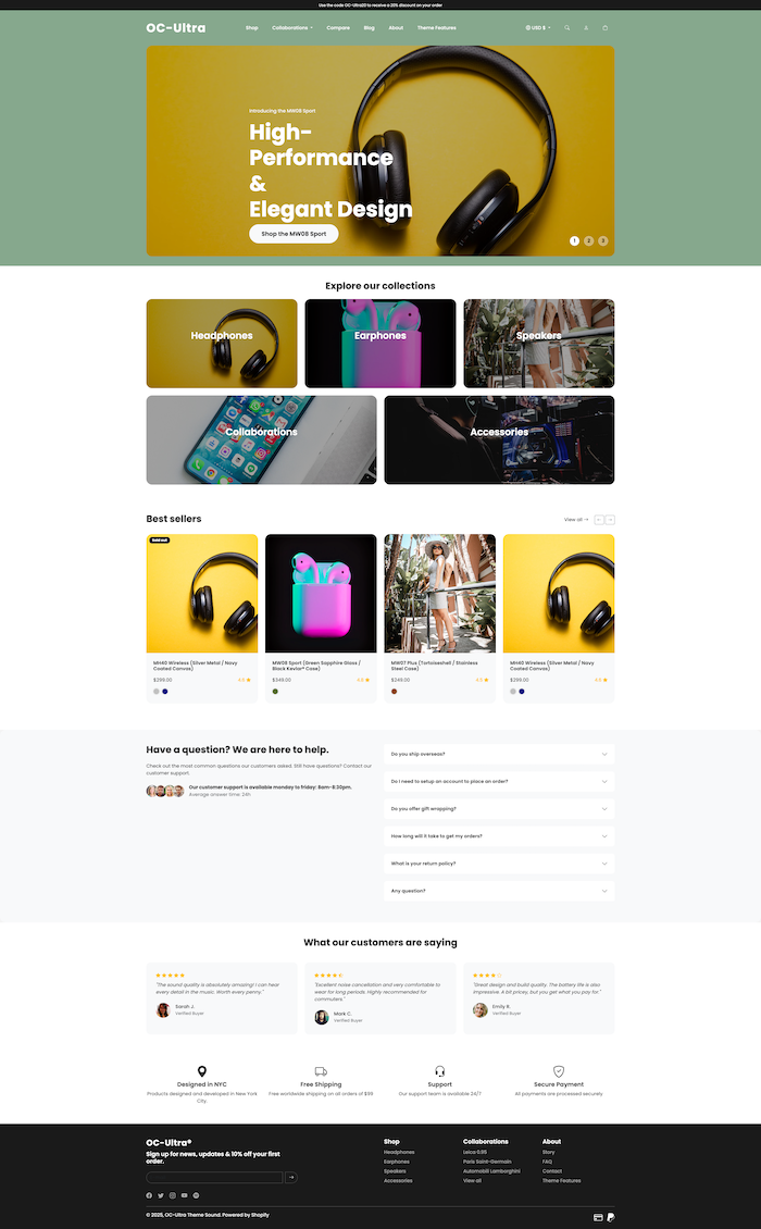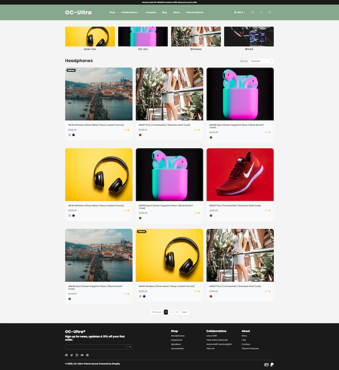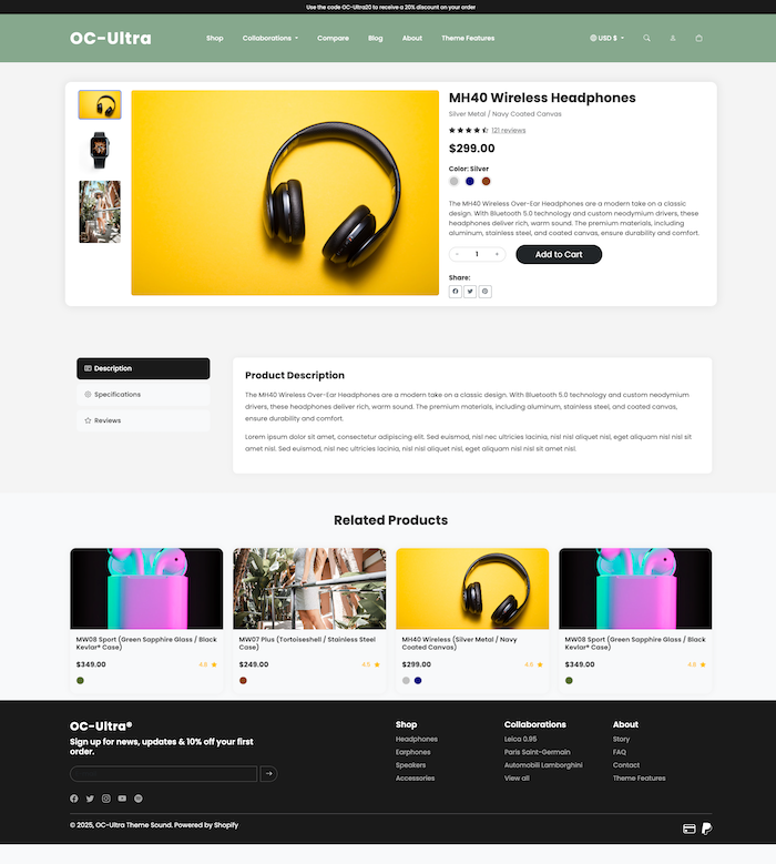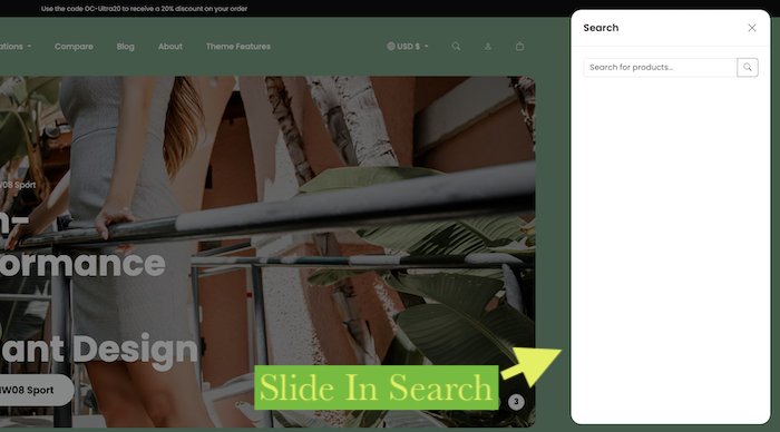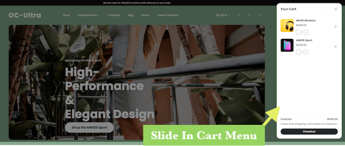 OC-Ultra features a seamless and intuitive slide-in functionality for the shop menu, search bar, and shopping cart. This allows users to access these essential features without navigating away from their current page, providing a smooth and uninterrupted browsing experience.
