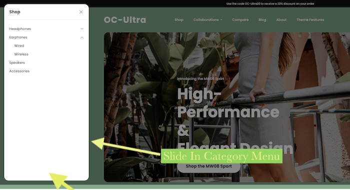 Shop Menu: The slide-in shop menu provides a clean and organized way to browse product categories and sub-categories, making it easy for customers to find what they're looking for.