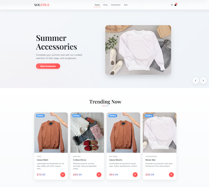 The theme's homepage features a prominent and engaging slideshow in the hero section. This allows you to showcase high-quality images and promotional messages to capture the user's attention. The slideshow is fully responsive and includes indicators for easy navigation between slides, making it an effective tool for highlighting your key products and offers.