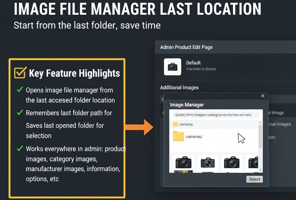 Automatically opens the image file manager at the last accessed folder. Saves time by remembering the previously used folder across all admin sections like products, categories, and manufacturers.