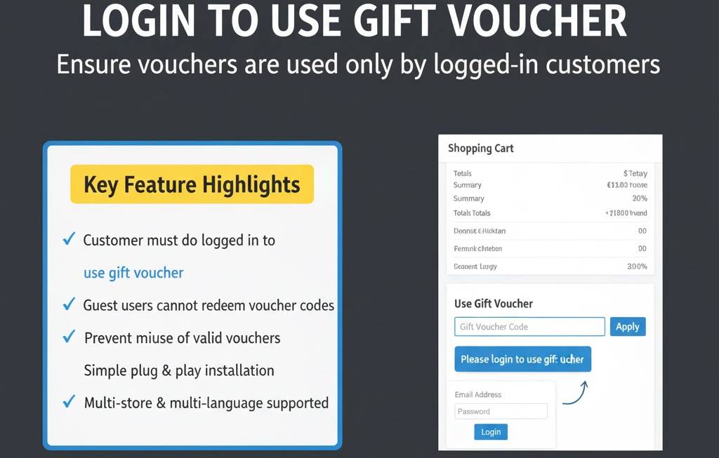 Ensure gift vouchers can only be redeemed by logged-in customers. Prevent guest users from using valid vouchers and enforce secure voucher usage for registered customers.
