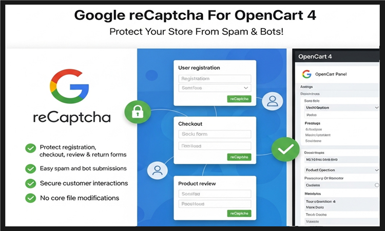 Add Google reCaptcha to OpenCart 4 to prevent spam and bot submissions. Protect registration, reviews, contact forms, checkout, and product return forms with ease.