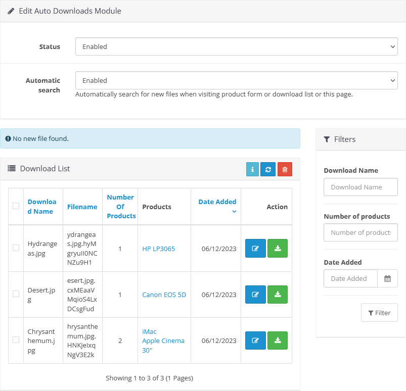 5. Efficient Download Filtering: Our extension offers filtering options based on download name, number of products assigned, and date added. This enables you to efficiently manage and organize your downloads based on specific criteria.
