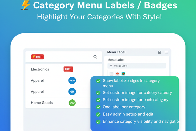 Display custom labels or badges in your category menu to highlight special categories. Add a small image for each category directly from admin and make your menu more engaging.