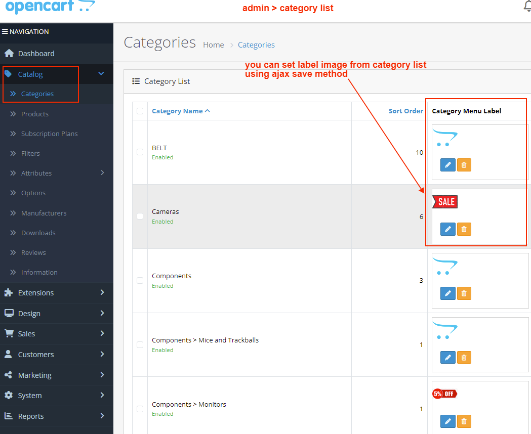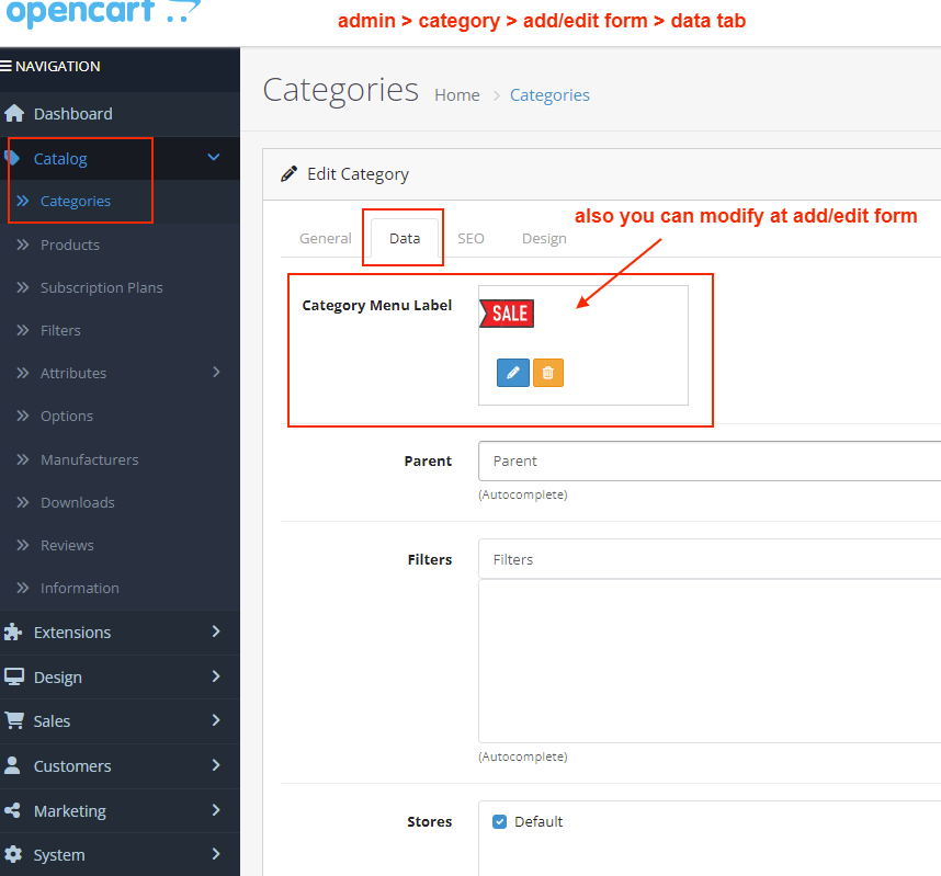 ✔ Add or edit label image in Admin → Category → Add/Edit → Data tab