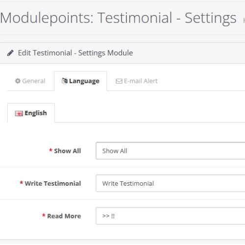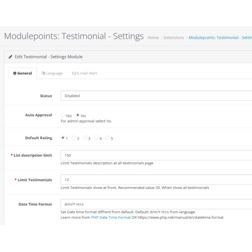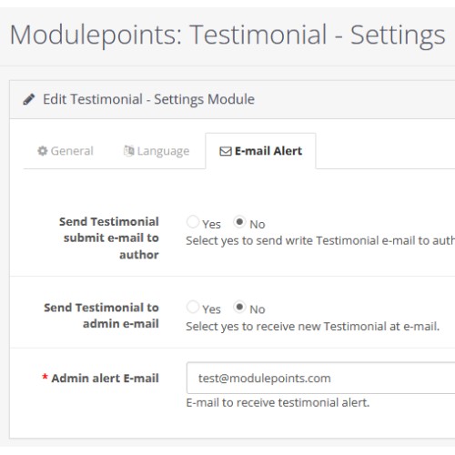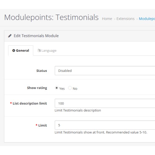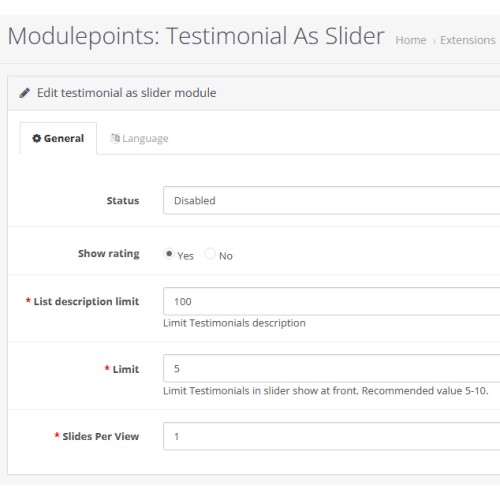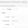 #2 Extensions > Modules and search for “Modulepoints: Testimonial – Settings” install if not then edit it. Save settings after you fill out necessary information.