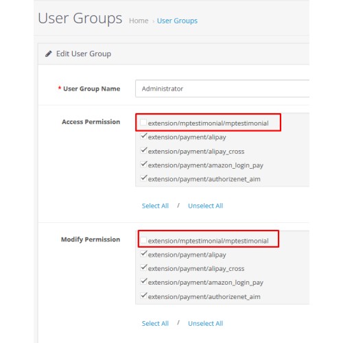Edit Administrator user group and look for files starting with “extension/mptestimonial”, check checkbox next to it for both Access, Modify permissions and update permissions by clicking Save button.