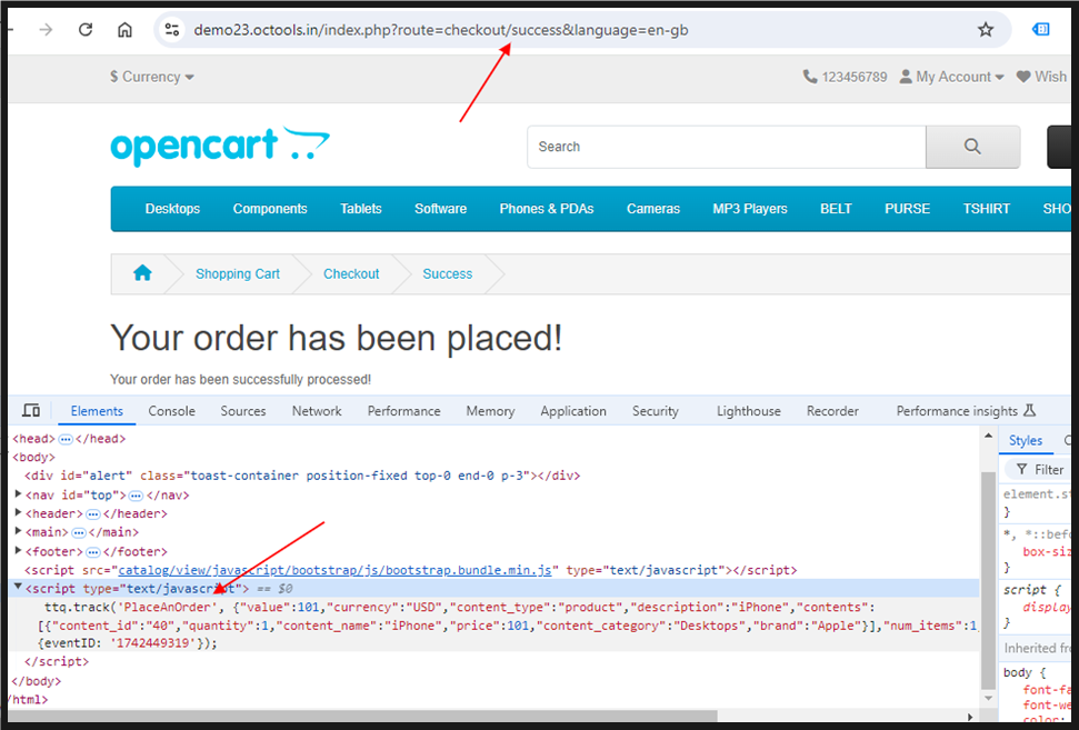 • Order conversion tracking using TikTok "PlaceAnOrder" events