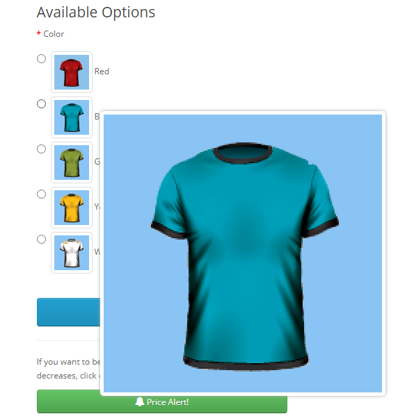 Image Preview: Displays a larger version of the product option image when hovered over.