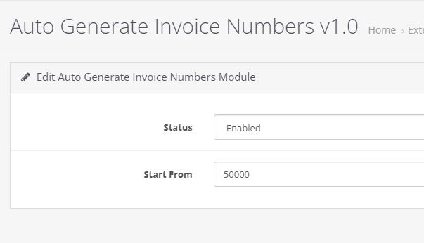 The second feature of this module is that the site administrator can go to the Extensions>Extensions section, and in the module section, a new extension called "Auto Generate Invoice Numbers v1.0" has been added, which the administrator can determine the start of invoice counting.