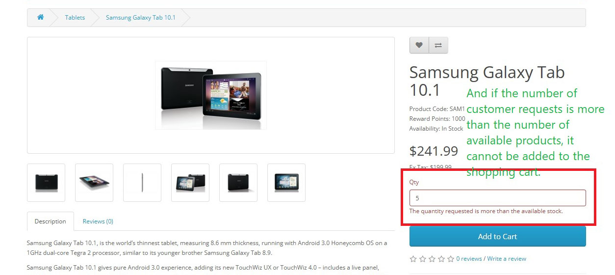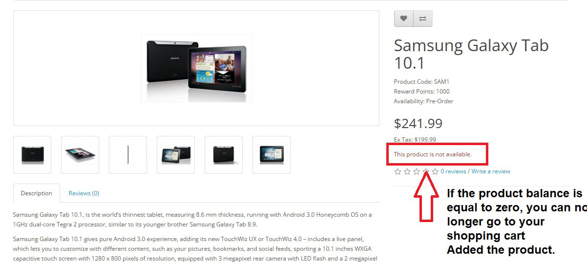 And if the product balance is equal to 0, the "add to cart" key will be hidden and you can no longer add that product to the shopping cart.