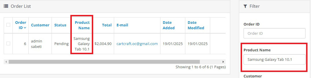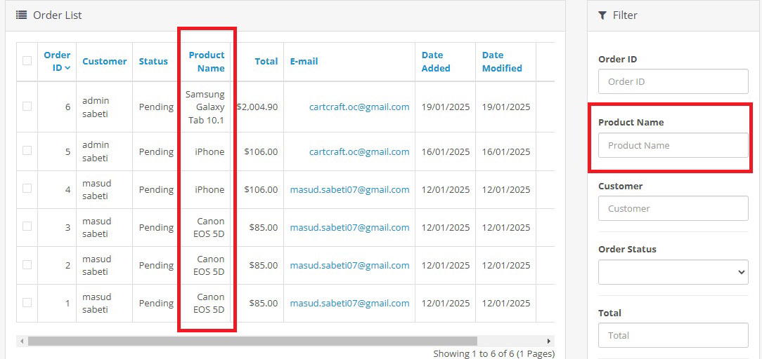 Using this module, you have a new field called "Product Name" on the "order list" page.