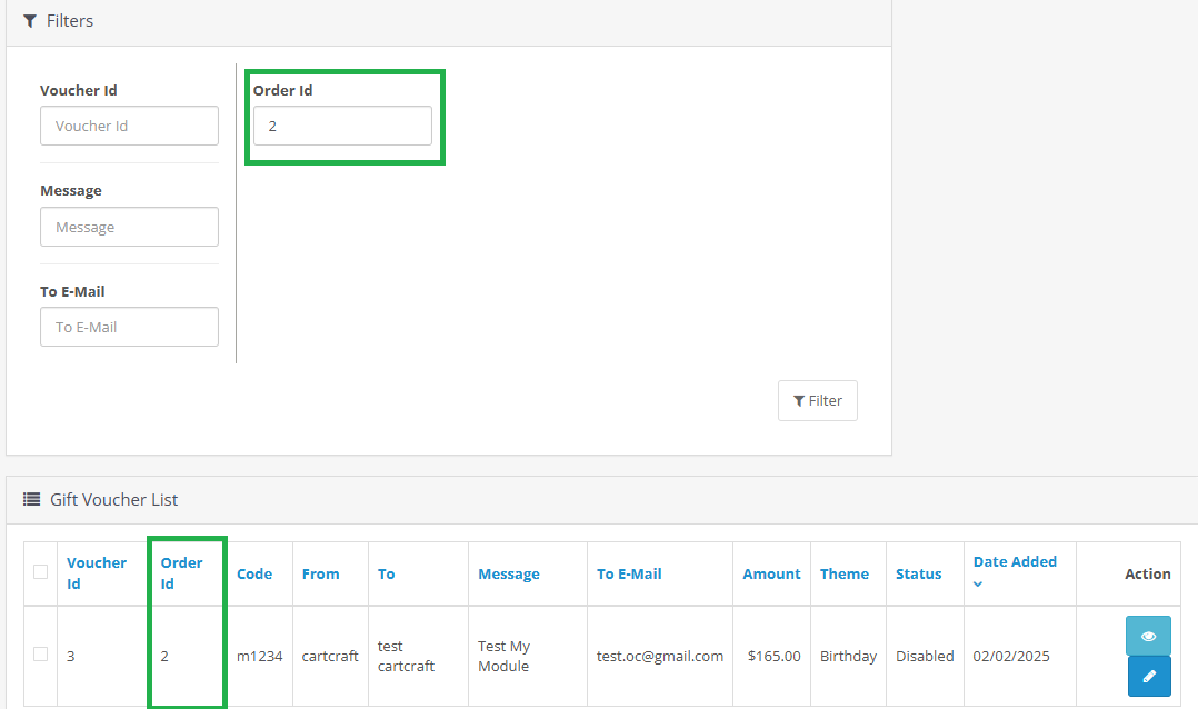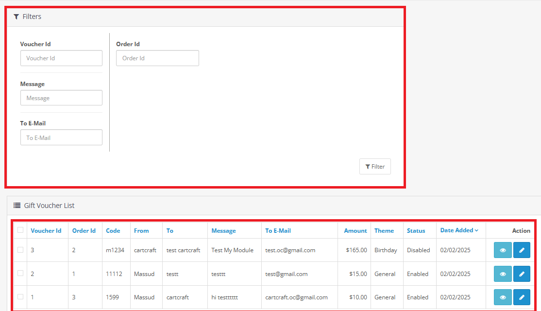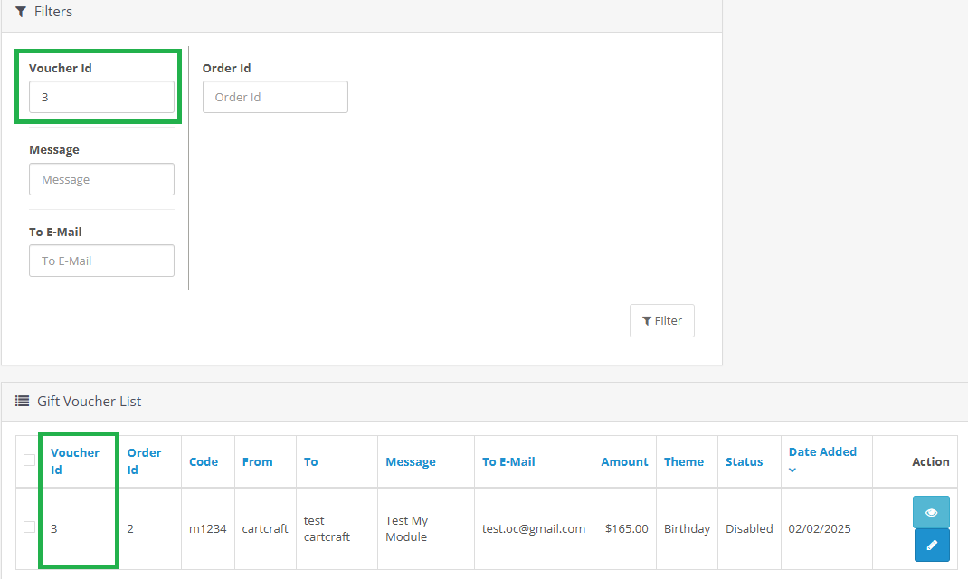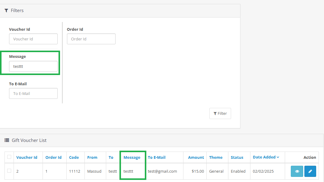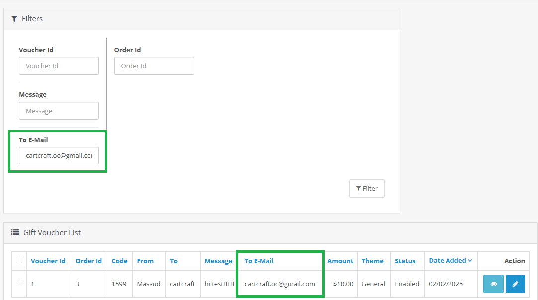 This module allows you to add new filters for the voucher list in the OpenCart management section. With this module, you can easily filter the voucher list based on voucher ID, message, recipient email, and order ID.