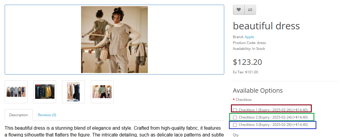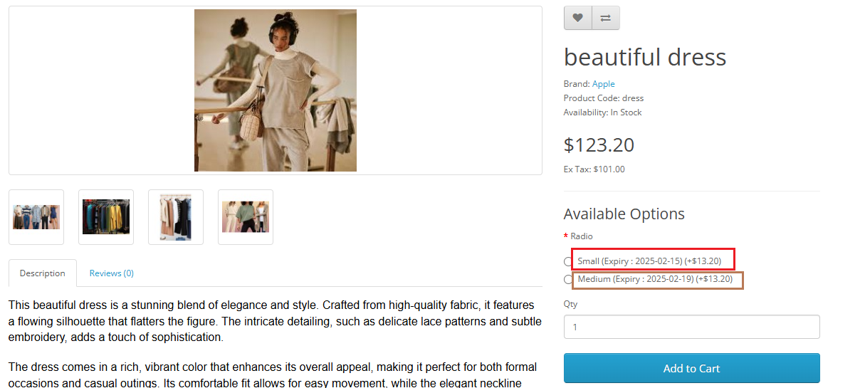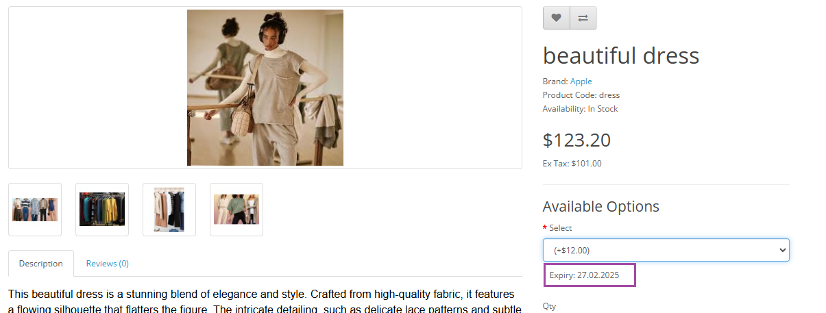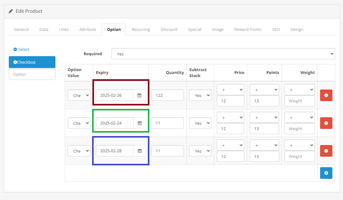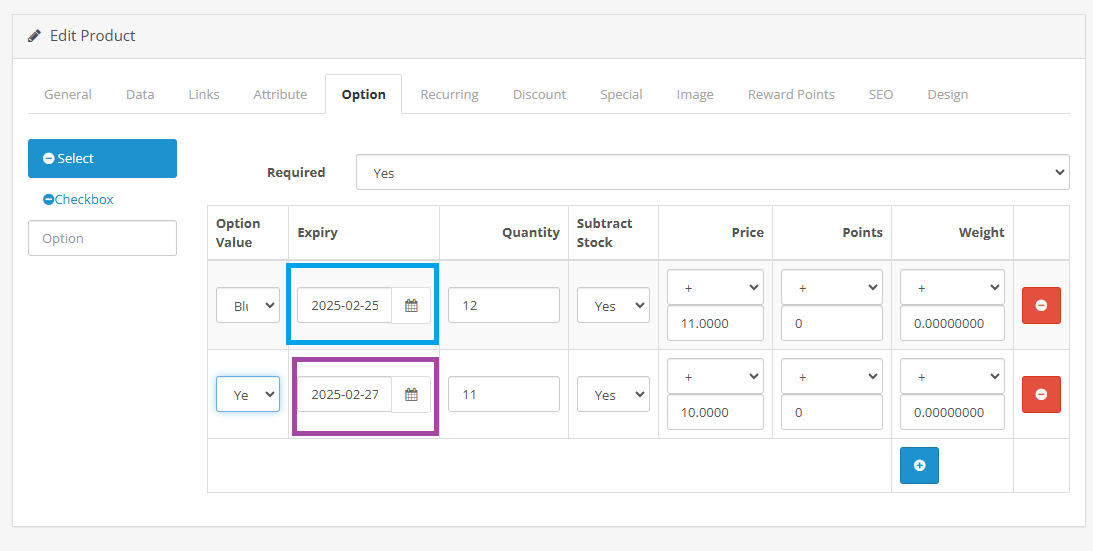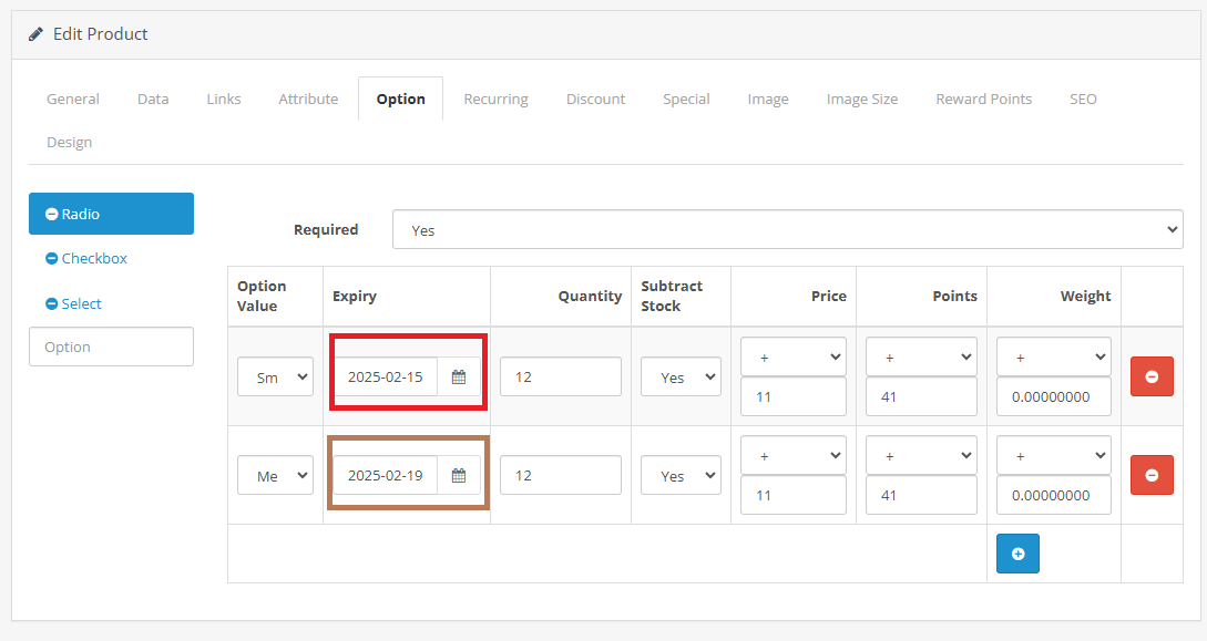 This module adds a new field called "Expiry" on the "Edit Product" or "Create Product" page in the options section, which the store admin can use to create an expiration date for the options.