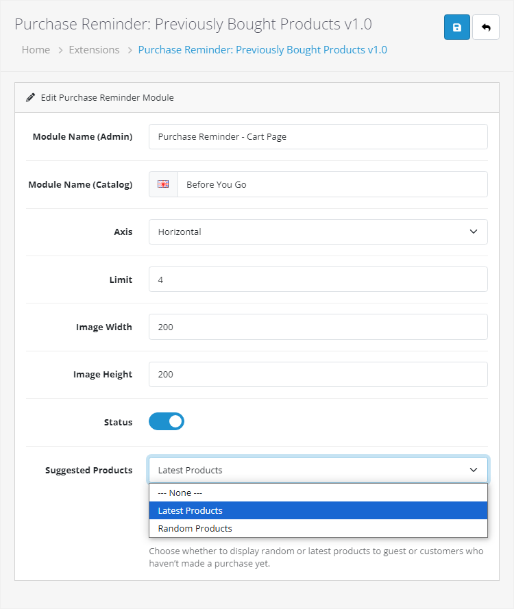 Suggested Products Type: Select from latest products, random products, or none based on customer purchase histories.